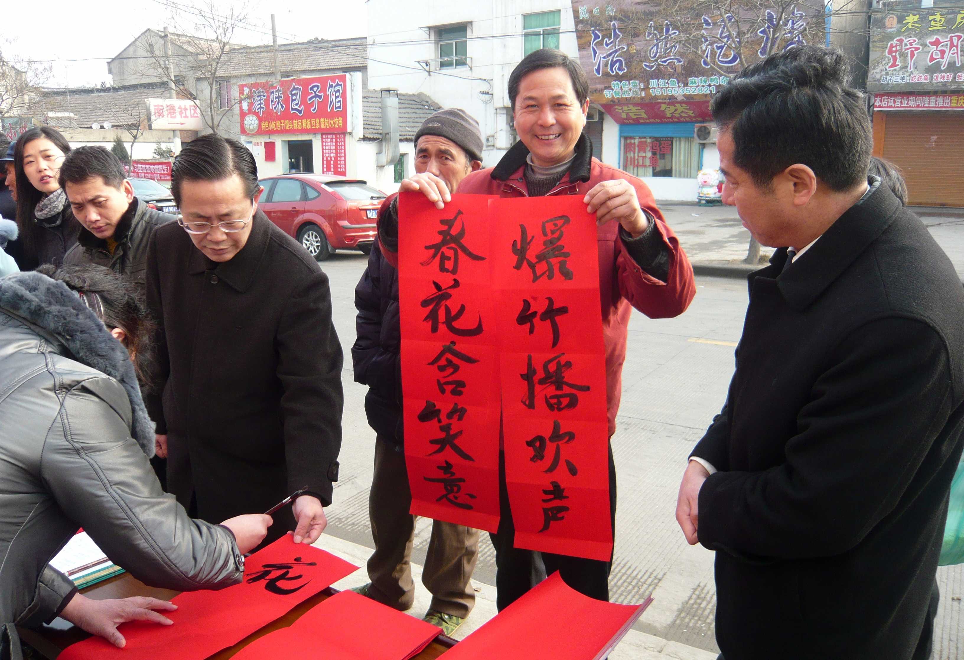 在“送文化、拜万家年”活动现场,来自九三学社的戴沁芬等4名书法家为广大居民免费赠送春联。他们设想周到,不仅携带了大量事先写好的春联分发给社区群众;还不顾寒风晨霜,现场为群众挥毫泼墨书写新春祝福,此举受到了社区领导和居民的热烈欢迎。活动现场人头攒动、气氛热烈,在活动布台尚未完成时,群众们就围上前来,纷纷要求书法家们为他们书写吉祥贺语祝福新春。李冰主委在活动现场,向社区居民赠送春联、祝福新春的同时,还和他们倾心交谈,了解居民们的生活和就业、就医、住房、子女入学等情况,倾听他们的呼声,转达党和政府的关心。