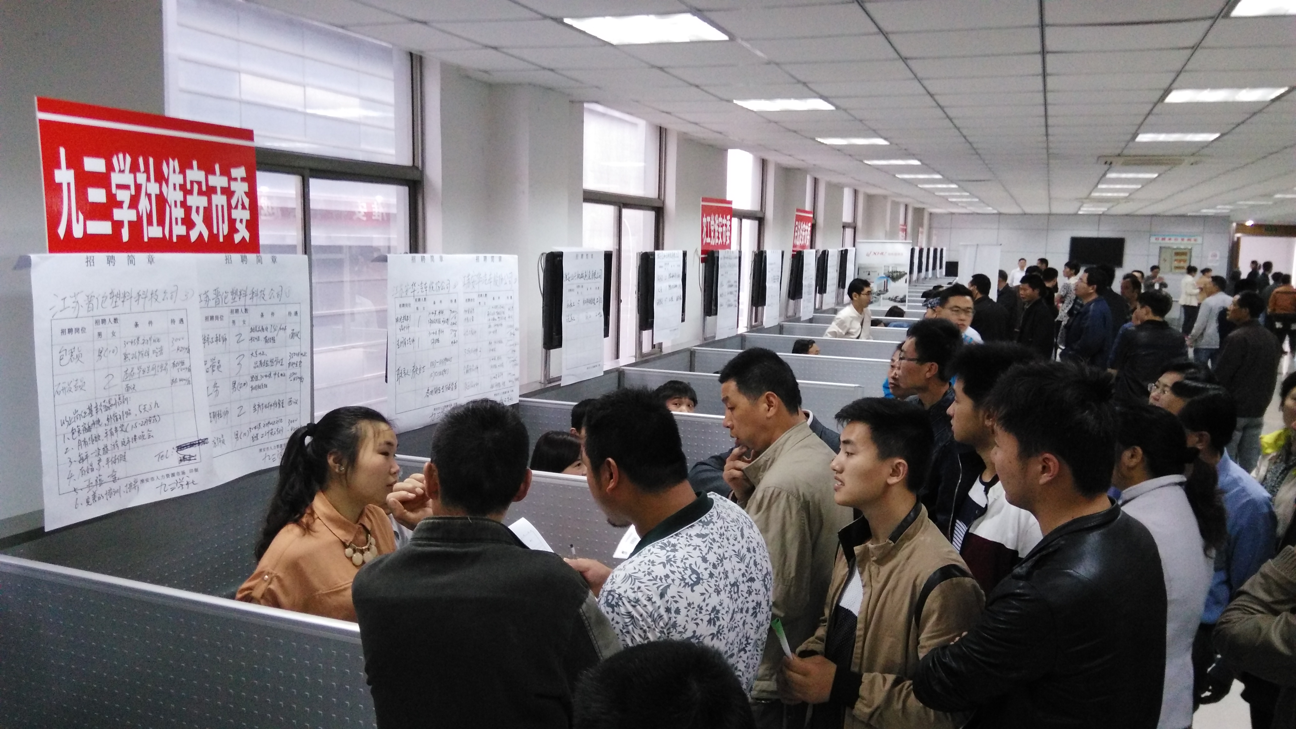 2015年5月29日上午,在淮安市人力资源市场,九三学社淮安市委组织江苏晋伦科技有限公司等7家企业参加“统一战线服务企业用工春季专场招聘会”,共提供35个岗位招聘191人,种类包括研发工程师、电子机械、化工、信息等。现场接待咨询人数480多人,当场达成用工意向74人,13人将参加面试。通过开展服务中小企业用工,扩大就业市场覆盖面,进一步助力淮商崛起,进一步助推淮安科学跨越发展。活动中,淮安市政协副主席、中共淮安市委统战部部长仲波在社市委副主委陈伏涛陪同下,来到社市委组织的招聘企业摊位前,与企业家亲切交谈,详细了解企业发展、企业招聘以及应聘者求职情况。