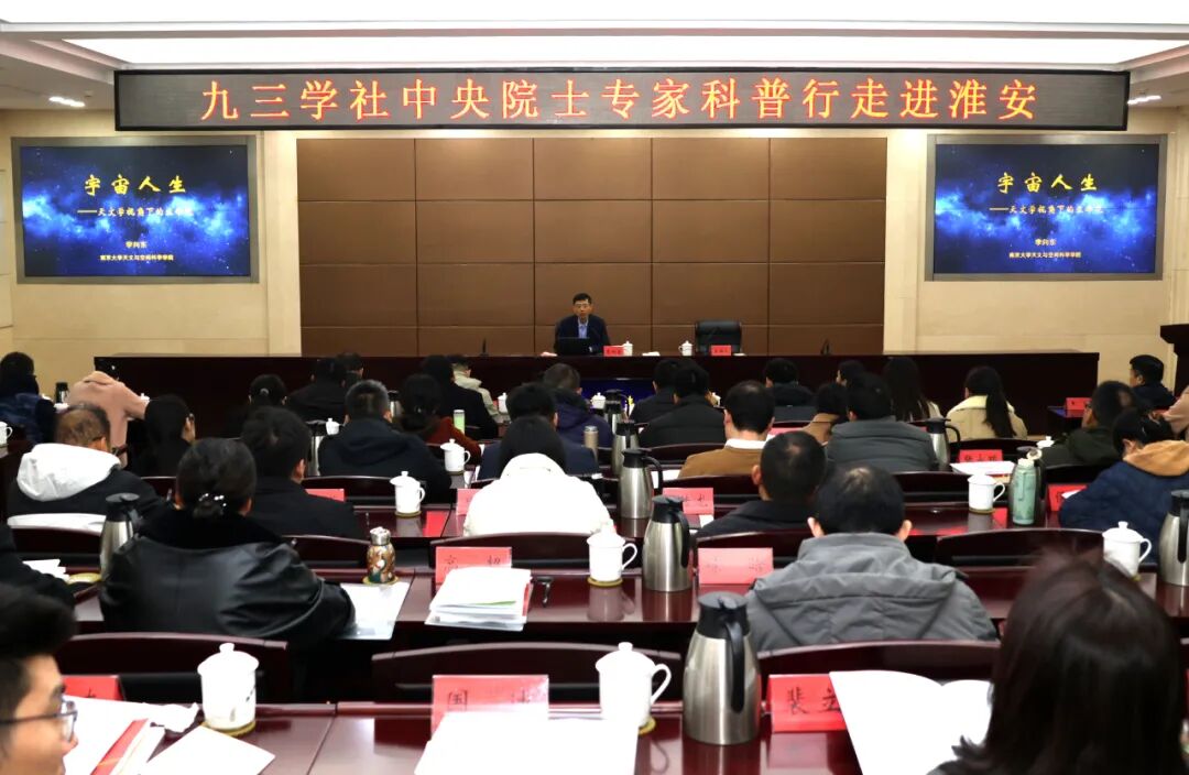 11月21日至22日,九三学社中央院士专家科普行活动在淮安成功举办。淮安市人大常委会副主任、九三学社淮安市委员会主委范更生出席活动。九三学社江苏省委员会社会服务处四级调研员马洪莉,社淮安市委会副主委高毅、杨颖、刘铭铭以及全市100余名社员等参加活动。活动邀请到教育部“长江学者”特聘教授、省政协常委、南京大学天文与空间科学学院院长李向东和首届“九三楷模”、九三学社中央宣讲团成员、中华全国供销合作总社南京野生植物综合利用研究院原院长张卫明两位专家莅临淮安开展专题讲座。